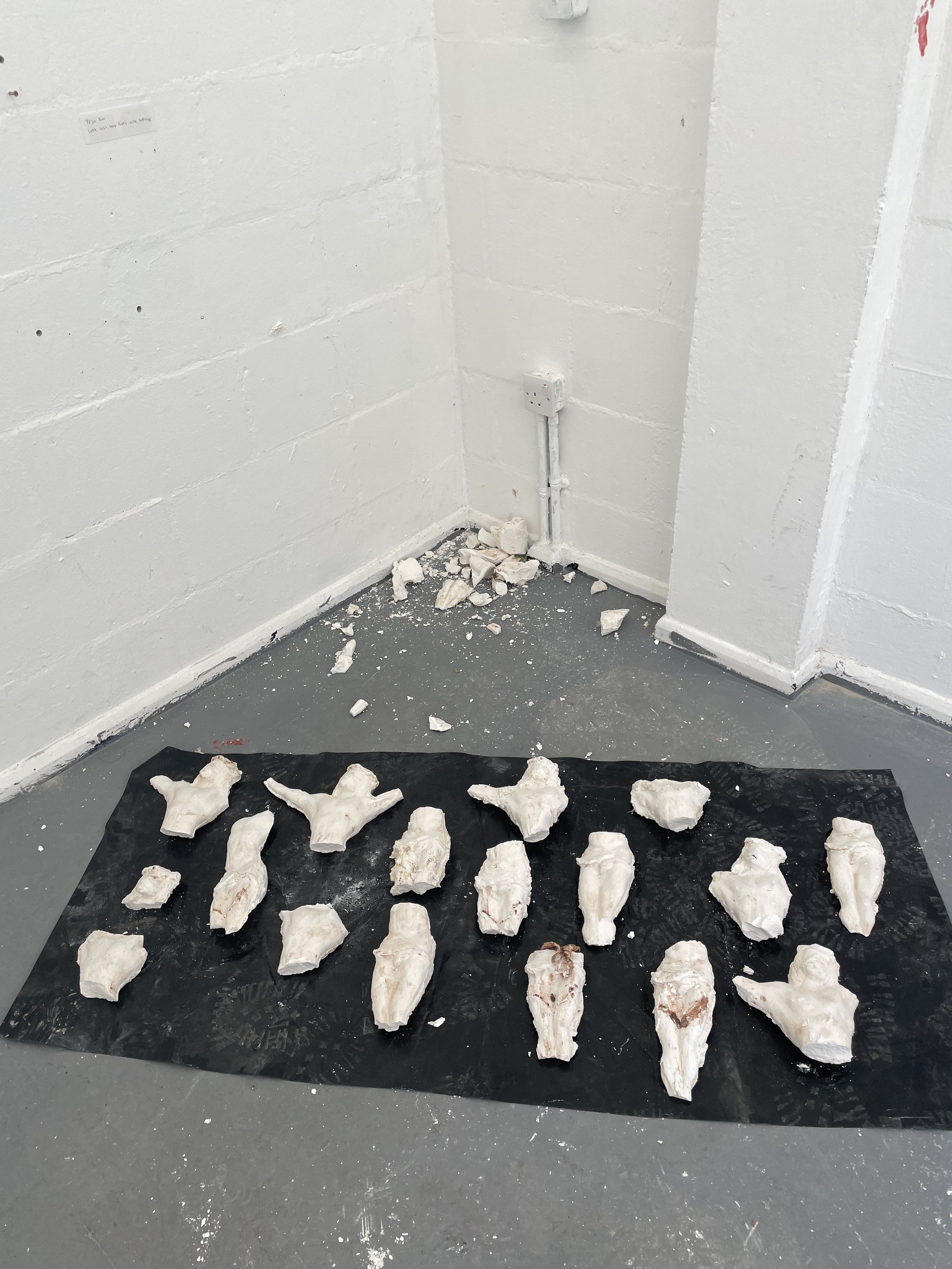 This final piece was presented as a performance piece within a group of nine people, with each member having a dedicated cast forming a collective that took on a suggestive arrangement reminiscent of a firing line. In a thought-provoking move, Diaz invited the audience to actively participate in the destruction of these sculptures. This spectacle unfolded as a symbolic act, resulting in a pile of disfigured bodies and debris which culminated into a chaotic assembly.
