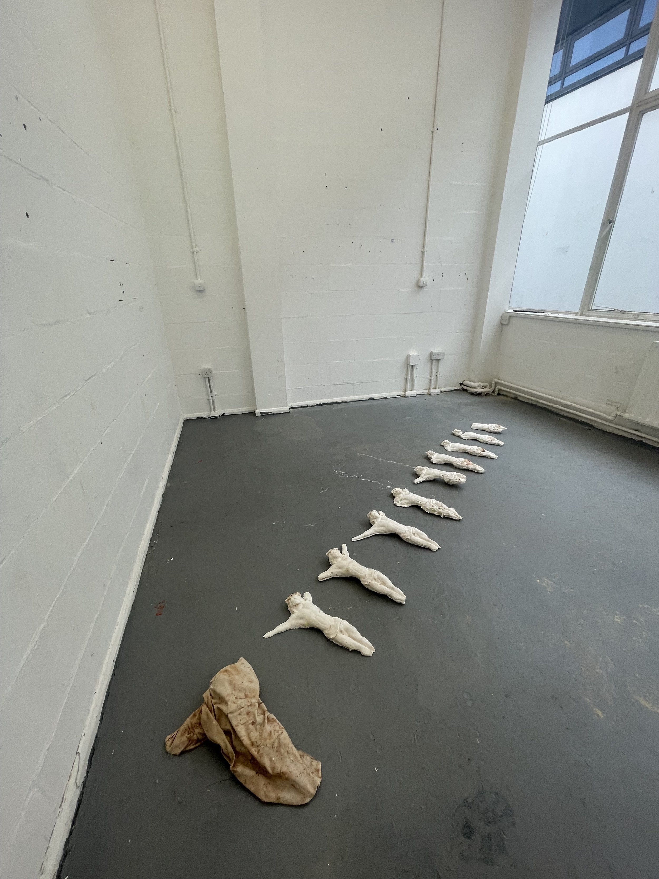 Diaz’s exploration for this piece draws inspiration from the mummification practices observed in Pompeii. Captivated by the encapsulation and preservation of a moment in time, he identifies parallels in his casting process, seeing it as a medium to replicate his state of mind and revelations. Initially Diaz cast this form in an aim to suggest human nature but it resulted in a more visceral and harrowing representation of horror and an unexpected state of reality. When exhibited, he placed the figure below a spherical object that resembled a ghost-like appearance close to the symbolic image of the Holy Ghost. Here Diaz creates an impressive symbolic narrative - a figure grounded on earth, looking up to an idealised form that’s beyonds its reach. The draped fabric and use of string around the neck signifies both hope and suffocation, embodying the fragile dance between earthly existence and the pursuit of perfection.